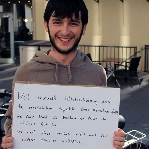 ...sexuelle Selbstbestimmung unter die persönlichen Aspekte eines Menschen fällt, bei deren Wahl die Freiheit der Person das höchste Gut ist. Und weil diese Freiheit nicht mit der anderer Menschen kollidiert.